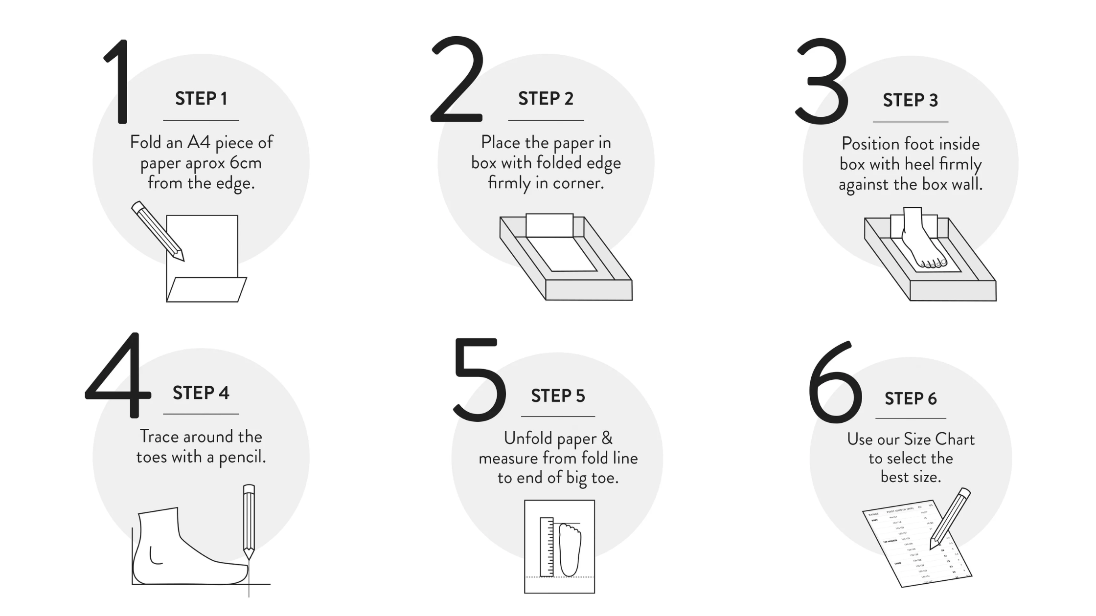 Follow the simple steps below on how to measure the foot, then use the Size Chart to find the perfect fit.