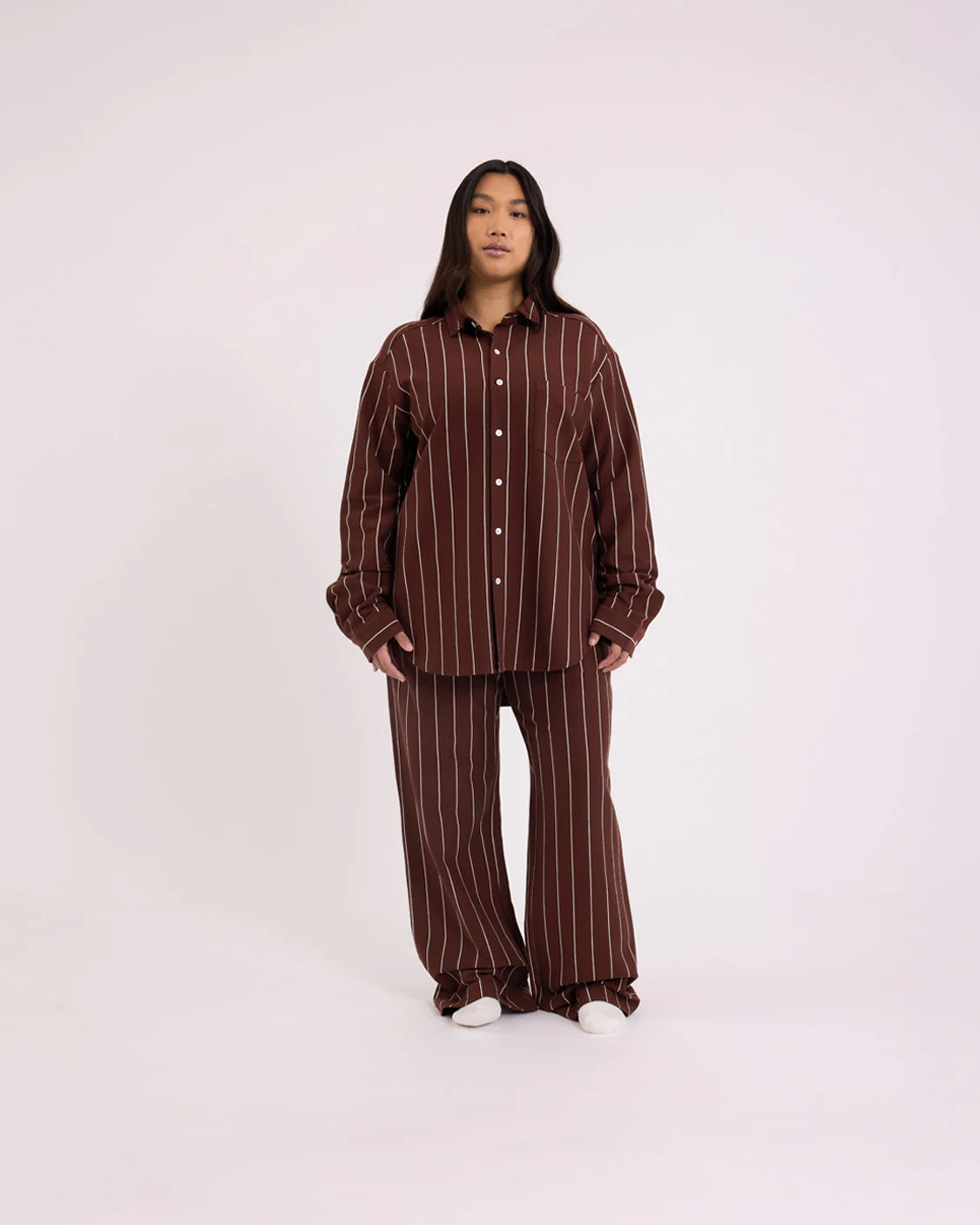 - Boxy fit for a classic collared shirt silhouette.
