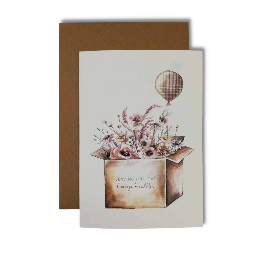 All illustrations are hand painted by Mama + Me with watercolour paints and then printed within Christchurch. Cards are Indigo printed on 250gsm textured natural white stock. They are A6 size, 148mm x 210mm and come packaged in a clear cello bag with a Kraft envelope.