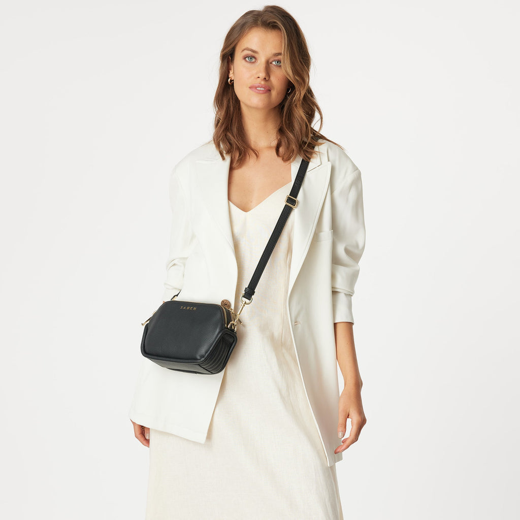 Details: Detachable and adjustable long leather strap to be worn over the shoulder or across the body; two interior secure zip compartments; one internal drop pocket; gold plated hardware; interior secure zip pocket; zip closure.