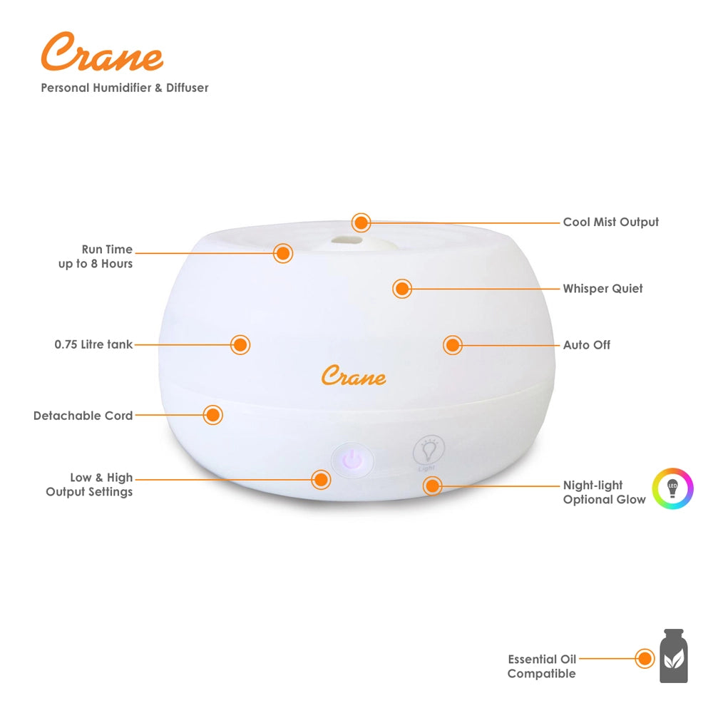 - 360° MIST NOZZLE: The Crane personal cool mist humidifiers & diffusers offer variable output settings & an adjustable 360° mist lid making it easy to send the mist in any direction. The mist output is perfect for rooms up to 160 square feet.